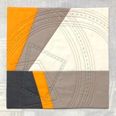 4 - Maureen- I deconstructed my photograph, created an abstract design and chose a complimentary minimalist quilting design. Angular and curve shapes were quilted by machine and big stitched by hand.