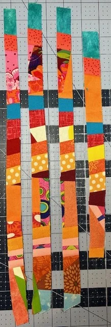 Let’s now work on the “tree trunks”. You may want to follow the tutorial and prepare a block of 1 to 1 ½ in wide strips of swatch of fabrics. You may also want to reach out to your scrap bin and randomly make yourself a nice crumb fabric. That is what I did☺
