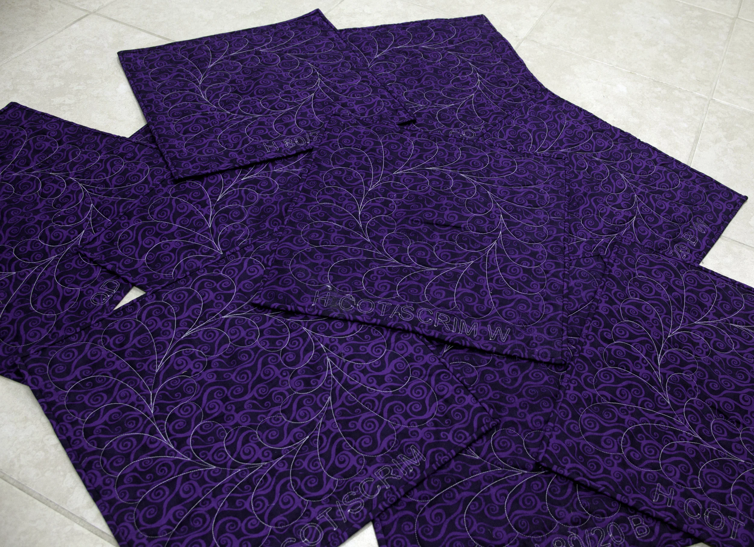 The pic below is of some of the samples she has made. She will wash half and leave half unwashed so we can compare, all from the same fabric and have the same feather design quilted on it. She will have samples of 25 battings.