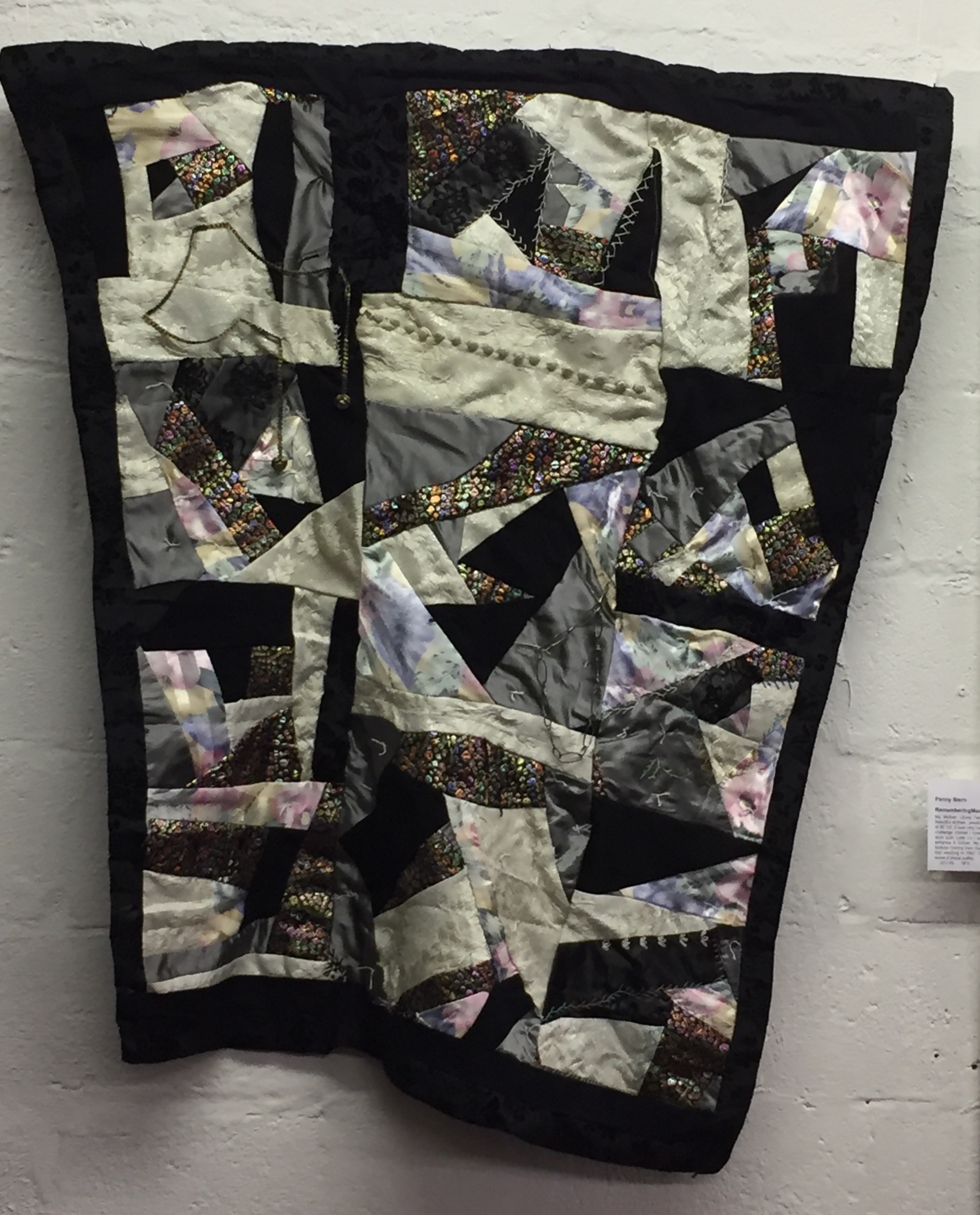 Materials Used: Quilting fabrics that I have had for years, fabric pieces given to me by quilting friends, jewelry made by my husband before he died, some ancient costume jewelry purchased in Israel souks plus some given to by members of the Boynton Bee and fabric flowers that I had made years ago. In an improv manner I wanted to combine the fabric and objects in a way that would show my appreciation to those I love. I cut the larger fabric into sections and appliqued smaller pieces on it with the result being a rectangle at the top with two different sized panels hanging from it.