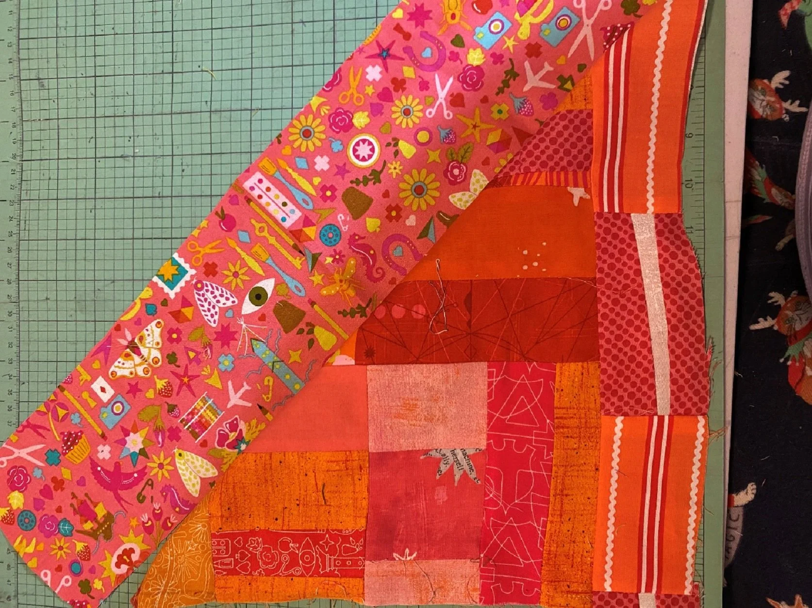 Here’s how it will look when you are cutting on a square. You will have your “arm” fabric laid out next to your pieced triangle. You will lay your strip of fabric on top of the background fabric and cut a GENTLE arc.