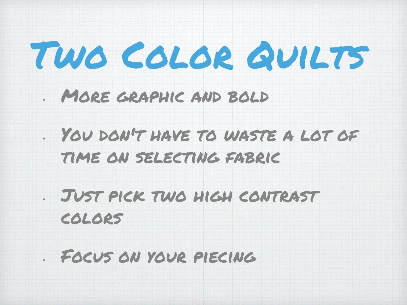 QUILTING: Use a contemporary approach to quilting. However, it does not have to be straight line quilting—there are many other options available. Use either machine or hand quilting. Remember that the thread used must be one of the colors.